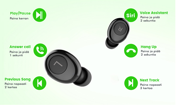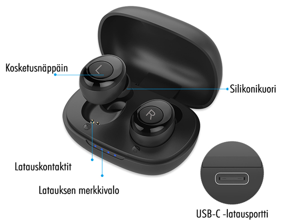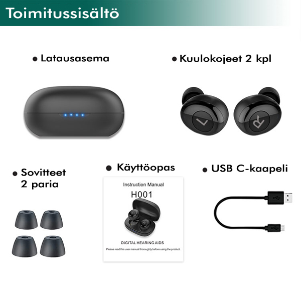1 pari kuulolaitteita, latauskotelo, 2 paria sovitteita, Latauskaapeli, Käyttöopas (suomi ja englanti)