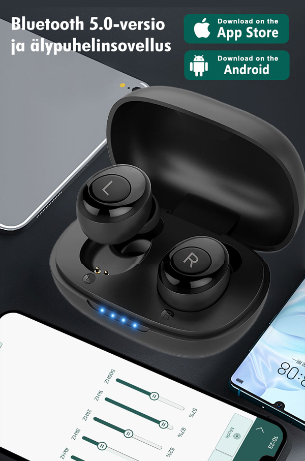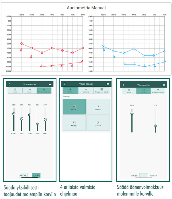 Voit säätää äänenvoimakkuutta ja taajuusaluetta älypuhelinsovelluksella erikseen molempiin korviin tarpeen mukaan. Lisäksi voit säätää erikseen molempien kuulokkeiden äänenvoimakkuutta yksinkertaisesti painamalla kuulokojeen nappia.