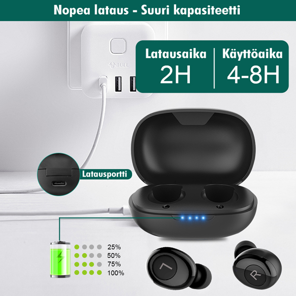 Ei paristoja. Laita kuulokojeet säilytysrasiaansa, kytke USB-johto virtalähteeseen ja anna kuulokojeiden latautua 6 h. Latauksen jälkeen kojeissa on virtaa jopa 3.5 tunniksi.